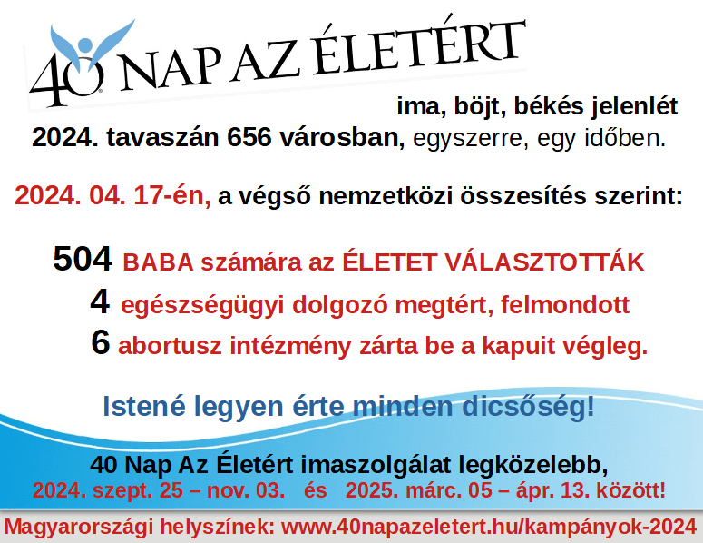 Az 40 Nap Az Életért kampányok tükrözik, hogy a közösségi cselekvés és az elkötelezett hívők imái milyen mély és tartós változásokat képesek előidézni. Együtt, imával és kitartással folytatjuk tovább a küzdelmet az élet tiszteletben tartásáért és védelméért.