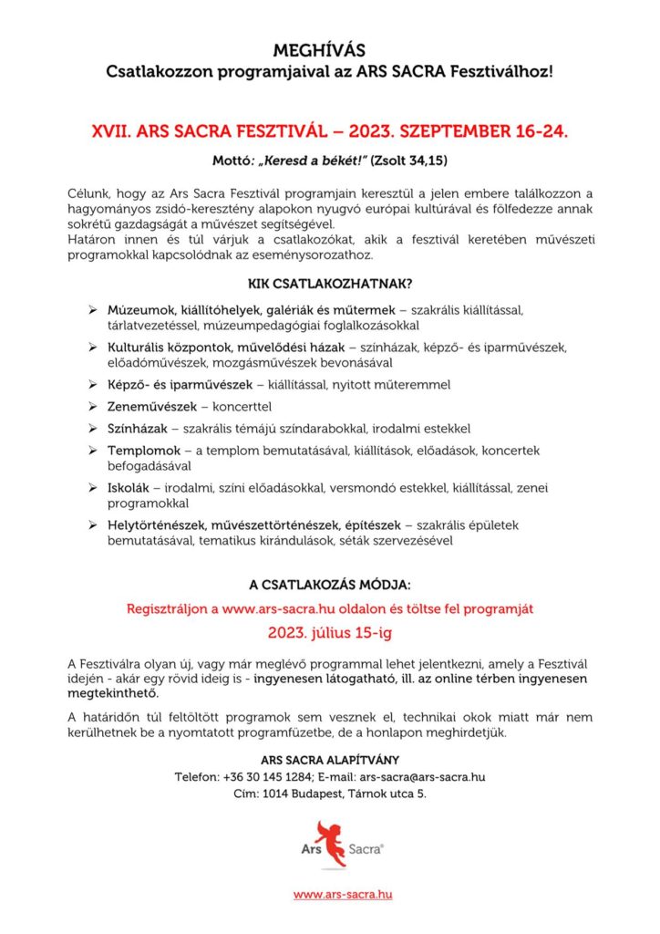 Csatlakozzon az ARS SACRA Fesztiválhoz és fedezze fel a hagyományos zsidó-keresztény alapokon nyugvó európai kultúra sokrétű gazdagságát! A Fesztivál célja, a kultúra mélyén nyugvó szakralitás felszínre hozatala, a nemzet lelki felemelése és sprirituális egységének segítése. Múzeumok, kiállítóhelyek, galériák, műtermek, kulturális központok, művelődési házak, képző- és iparművészek, zeneművészek, színházak, templomok, iskolák, helytörténészek, művészettörténészek és építészek is csatlakozhatnak a Fesztiválhoz. Regisztráljon a www.ars-sacra.hu oldalon és töltse fel programját 2023. július 15-ig. A programok lehetnek újak vagy már meglévők, de a Fesztivál idején ingyenesen látogathatóak kell, hogy legyenek. További információkért látogasson el a honlapra: www.ars-sacra.hu. Bővebb információért hívja az Ars Sacra Alapítványt a 06 30 145 1284 telefonszámot vagy írjon e-mail: ars-sacra@ars-sacra.hu címre.