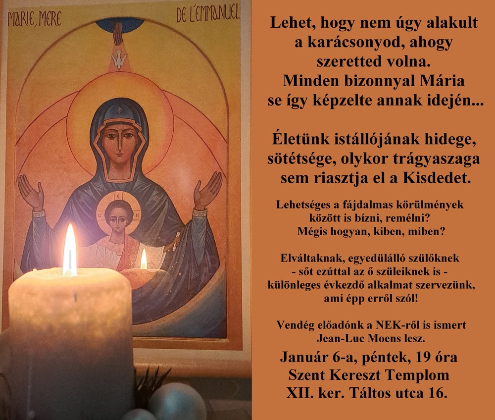 Január 6-án este 7 órakor különleges évkezdő találkozót tart elváltaknak, egyedülálló szülőknek az Emmánuel közösség. Az alkalom témafelvezetését Jean-Luc Moens hétgyerekes, tizenhárom unokás belga matematikus tartja. Az est témája: remélni és bízni minden körülmények között. Erre az alkalomra kivételesen a gyerekeikért, unokáikért aggódó nagyszülőket is várják a Táltos utca 16-ba.